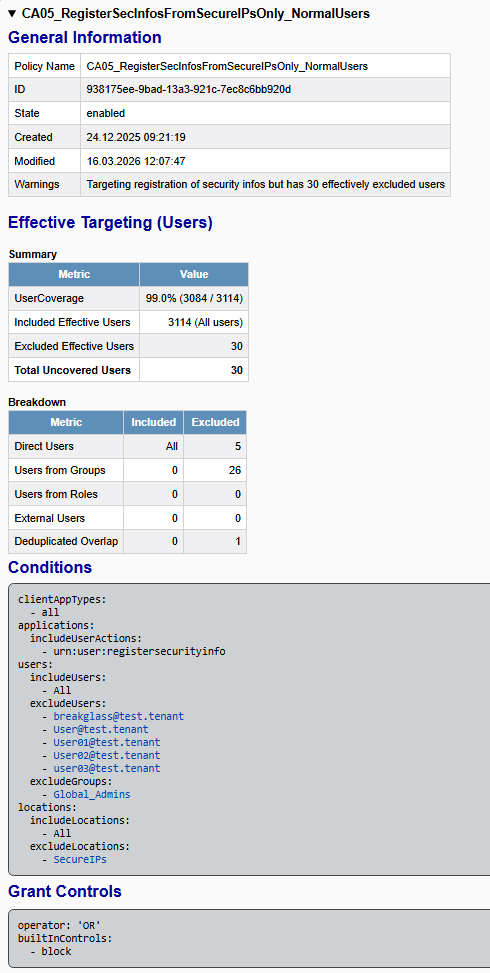 A common approach is to scope important Conditional Access policies, for example policies enforcing MFA, to specific groups. In principle, this can work well. In practice, however, we often find that not all relevant users are actually members of the targeted groups. As a result, some users remain outside the scope of the policy and are therefore not protected as intended.
