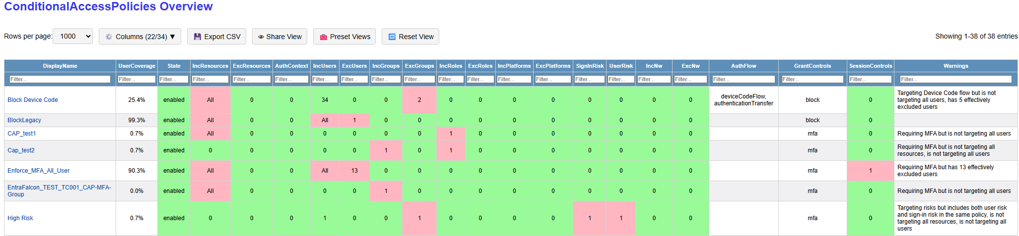 -ExportCapUncoveredUsersswitch when running EntraFalcon. This can help identify users who fall outside the scope of an important policy:Disclaimer: A full technical analysis of Conditional Access remains difficult, especially where multiple policies target different identities to enforce the same control. EntraFalcon therefore uses different confidence levels. Findings are marked as Sure where an important control is clearly missing entirely, for example blocking the device code flow or legacy authentication. Findings related to potentially weak configurations are marked as Require Verification. In addition, the coverage statistics in the current version do not fully enumerate all external user inclusion and exclusion types (only normal B2B guests are covered).