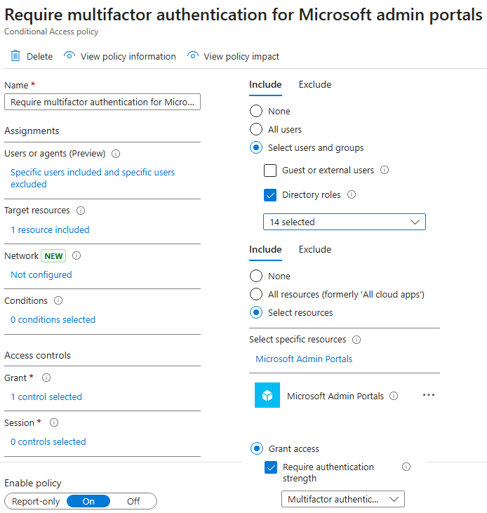 As an example, we use the official Microsoft policy template Require multifactor authentication for Microsoft admin portals. This Conditional Access policy targets Global Administrator and other privileged roles, applies to the resource Microsoft Admin Portals, and requires MFA: