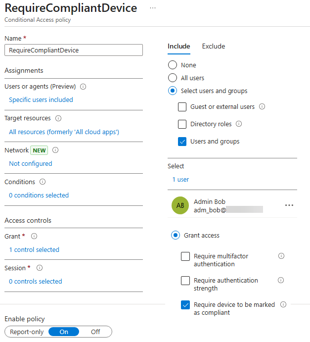 These pre-consented permissions have since been reduced. However, it is still possible, for example, to read all devices through the Microsoft Graph API. Assume there is a policy named RequireCompliantDevice that directly includes Bob, targets all resources, and requires a compliant device: