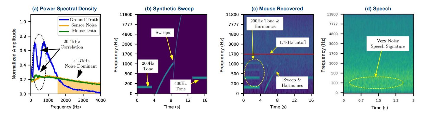 In graph (a), the blue color shows the frequency response typical of human speech — this is the source data. Green represents what was captured using the computer mouse. The yellow represents the noise level. The green corresponds very poorly to the original audio information and is almost completely drowned in noise. The same is shown in a spectral view in graph (d). It looks as though it’s impossible to recover anything at all from this information. However, let’s look at graphs (b) and (c). The former shows the original test signals: tones at 200 and 400Hz, as well as a variable frequency signal from 20 to 16 000Hz. The latter shows the same signals, but captured by the computer mouse’s sensor. It’s clear that some information is preserved, although frequencies above 1700Hz can’t be intercepted.