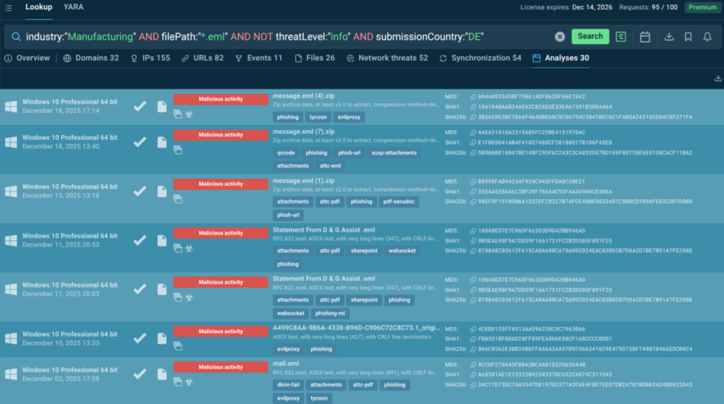 industry:”Manufacturing” AND filePath:”*.eml” AND not threatLevel:”info” AND submissionCountry:”DE”