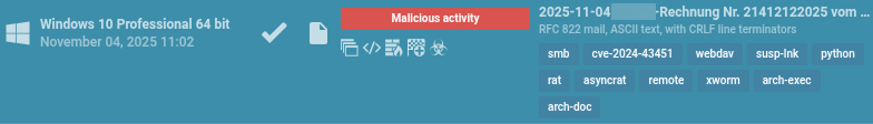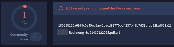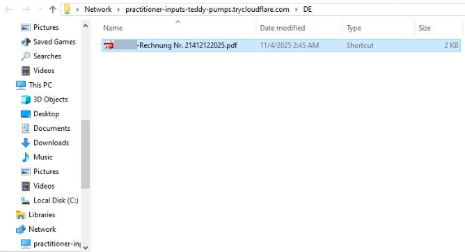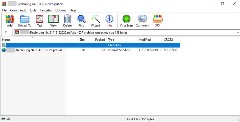 - Archive contained “COMPANY_NAME-Rechnung Nr. 21412122025.pdf.url”, a shortcut file masquerading as a PDF;