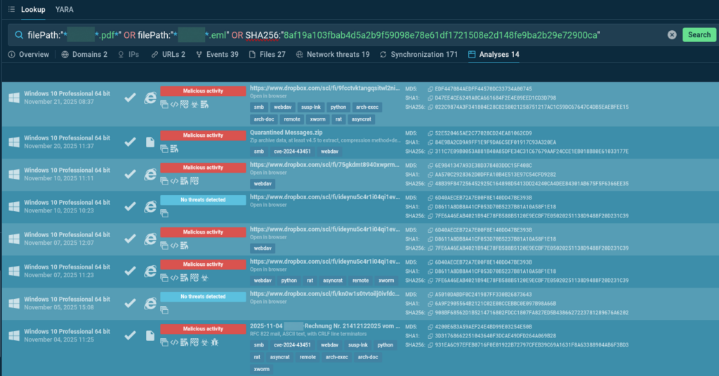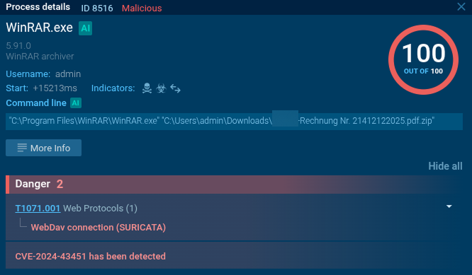 This case clearly shows that attacks using COMPANY_NAME-themed lures, WebDAV and CVE-2024-43451 abuse remain highly relevant for manufacturing companies, especially in Germany. More importantly, it demonstrates how proactive threat hunting changes the security posture entirely.