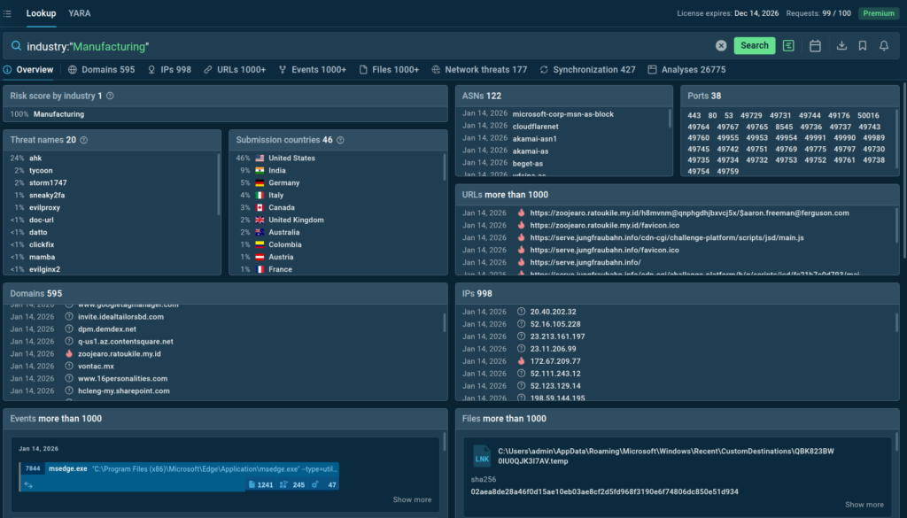 With ANY.RUN’s Threat Intelligence Lookup, threat intelligence becomes a living, searchable environment rather than a static feed. For manufacturing companies facing constant operational pressure, this proactive approach can mean the difference between uninterrupted production and costly downtime.