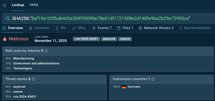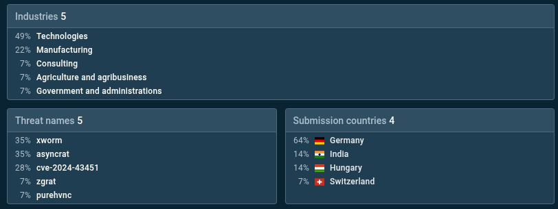 Since AsyncRAT and XWorm are widely used, we narrow our focus to the vulnerability itself. A lookup for CVE-2024-43451 shows that most samples originate from the EU, with Germany accounting for roughly half of them. Manufacturing once again appears among the primary targeted industries. WebDAV connections are present in all samples, indicating standardized attack logic.
