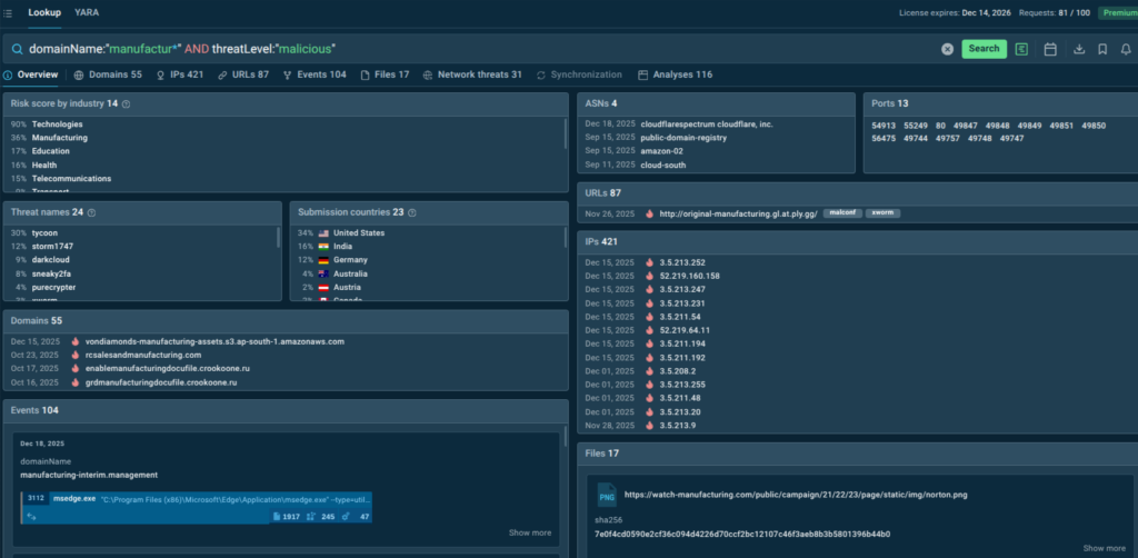 Threat Intelligence Lookup also allows us to search for malicious activity tied to industry-specific domain patterns. By querying domains containing fragments like “manufactur” and filtering for confirmed malicious activity, we uncover more than 100 sandbox analyses and dozens of suspicious domains.