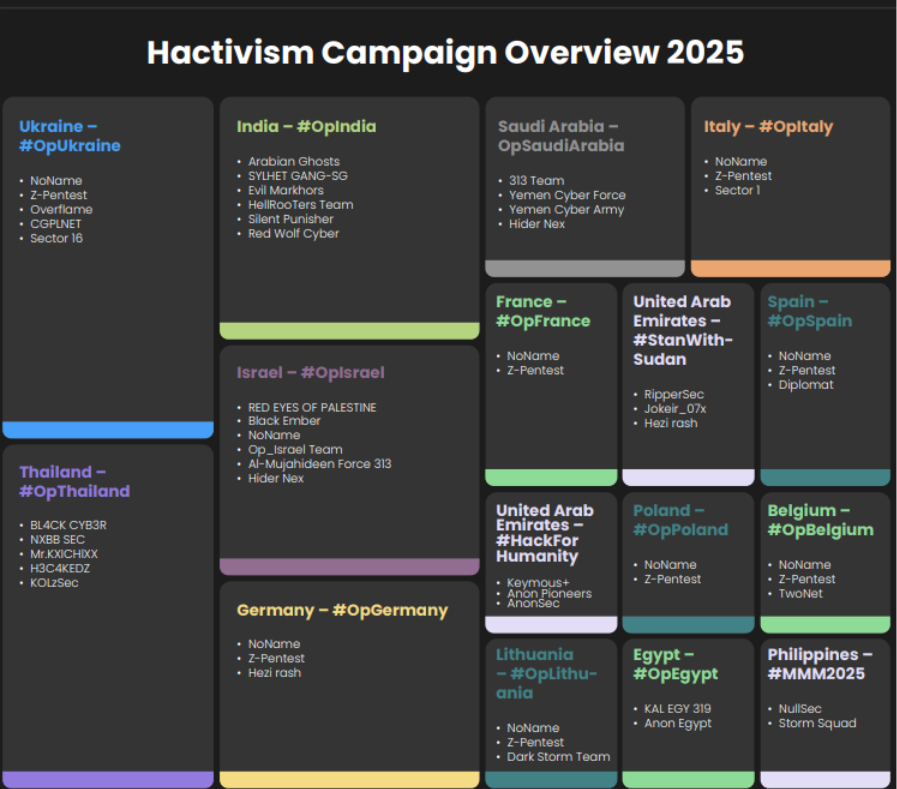 In 2025, hacktivism evolved into a globally coordinated threat, closely tracking geopolitical flashpoints. Armed conflicts, elections, trade disputes, and diplomatic crises fueled intensified campaigns against state institutions and critical infrastructure, with hacktivist groups weaponizing cyber-insurgency to advance their propaganda agendas.