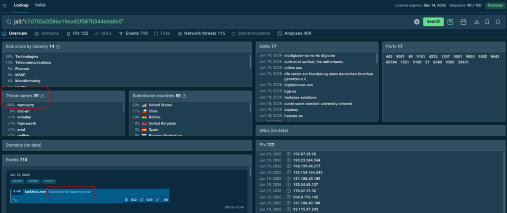 Now let’s consider a situation where JA3 is associated with malware, but clarifying context is needed. For example, JA3 hash e7d705a3286e19ea42f587b344ee6865 in the ANY.RUN Sandbox is strictly associated with WannaCry. Yet the hash itself belongs to an old version of TOR.