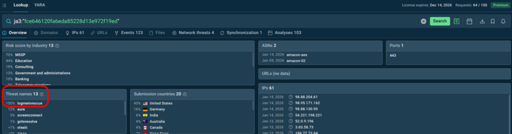 • Logmeinrescue Riskware JA3-hash: fce646120fa6eda85228d13e972f19ed