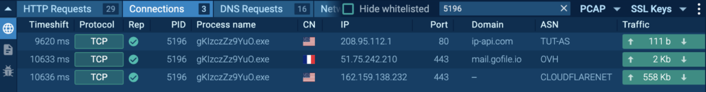 In the Connections tab, filtered by the malicious process PID, you can see the IPs and domains it contacted.