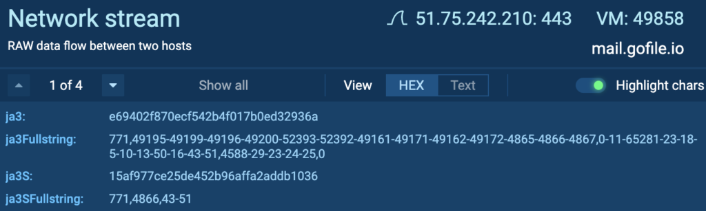 Sandbox analyses featuring the JA3 hash found via TI Lookup