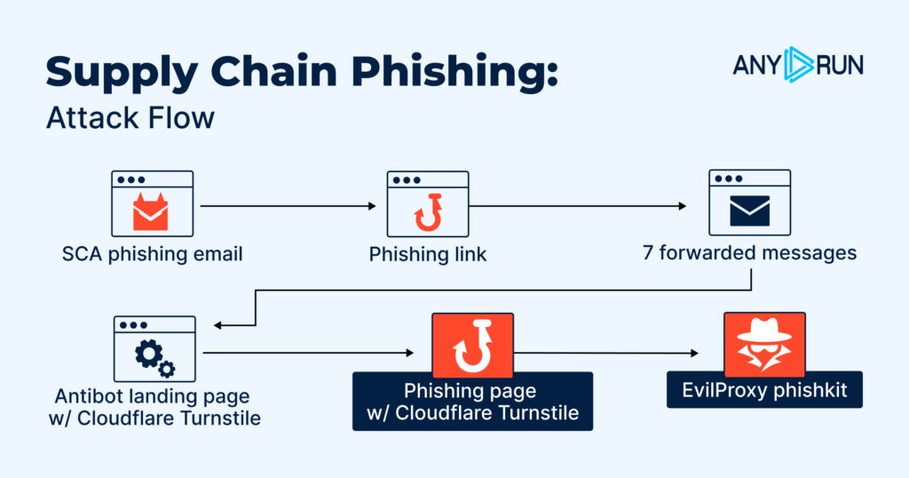 • Attack chain: SCA phishing email → 7x forwards → phishing link → Cloudflare Turnstile antibot page → Turnstile-protected phishing page → EvilProxy AiTM for Microsoft credential theft.