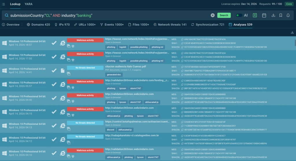For example, a query such as submissionCountry:”CL” AND industry:”banking” can help teams understand what is actively targeting Chile’s financial sector. This gives analysts faster context for triage, supports continuous risk management, and helps organizations build monitoring around real threats rather than assumptions.