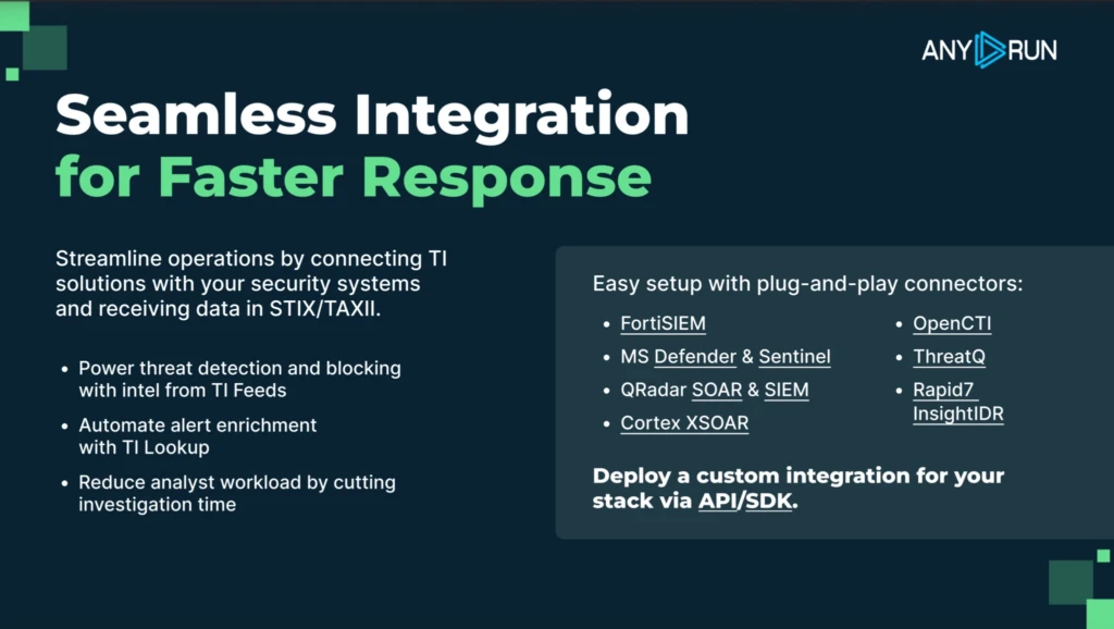 ANY.RUN helps reduce that friction by connecting threat intelligence and sandbox analysis directly to existing security workflows through ready-made connectors, STIX/TAXII, and API/SDK options. This allows teams to move investigation data into SIEM, SOAR, EDR, and TIP environments faster, so enrichment, correlation, and response can happen with less manual effort.