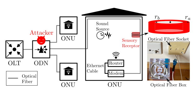 Diagram of a provider’s fiber-optic network showing the location of the attacker and the room targeted for eavesdropping. Source
